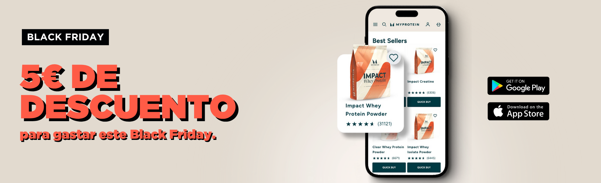 Recibe 5€ de descuento al gastar 20€ o más en productos en www.myprotein.es. Entra en nuestra app, añade tus productos favoritos a la cesta y los 5€ se aplicarán automáticamente.