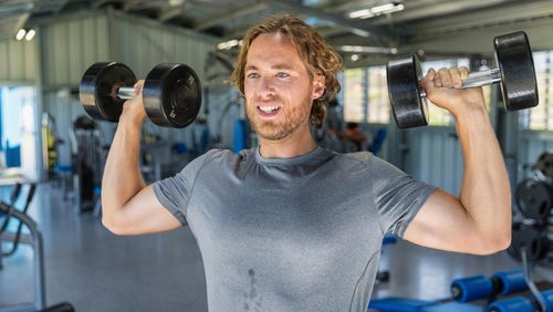 - Mantén la mancuerna en esa posición durante un segundo y bájala lentamente hacia abajo. A continuación, repite el proceso con el brazo contrario.