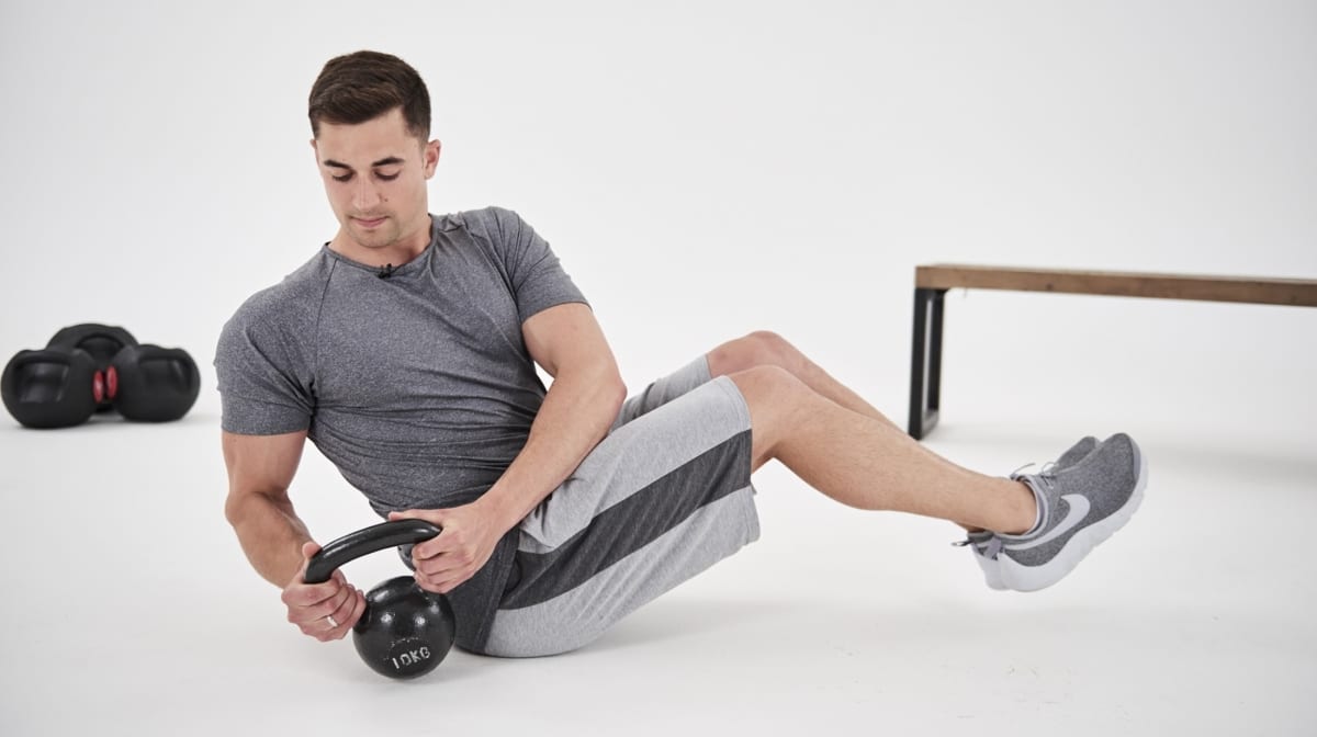 - Siéntate en una superficie plana, extiende tus piernas y sujeta la pesa rusa con ambas manos.