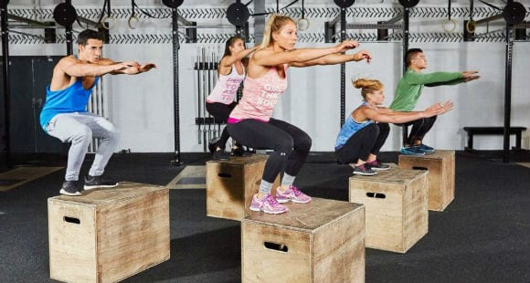 - Haz una sentadilla y levántate de forma explosiva dando un salto hacia el cajón.