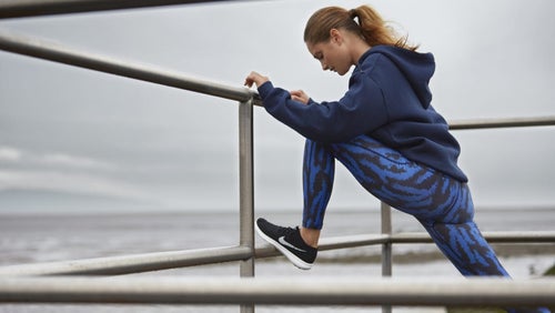 - Realiza una zancada flexionando ambas rodillas hasta que el muslo izquierdo esté casi en paralelo al suelo. Mantén la espalda recta y los hombros a línea.