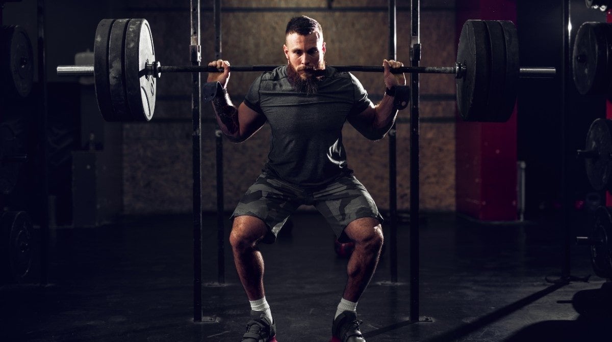 - De pie, con las piernas juntas y los pies separados apenas unos centímetros, apoya una barra sobre tus trapecios y baja las caderas hacia el suelo flexionando las rodillas hasta que estas formen un ángulo de 90 grados.