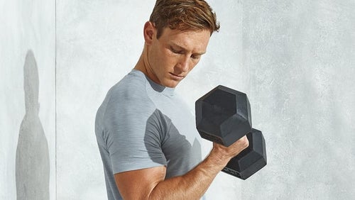 - Sujeta una mancuerna con cada mano con los brazos flexionados (como en la parte alta del curl de bíceps) con las palmas mirando hacia ti.