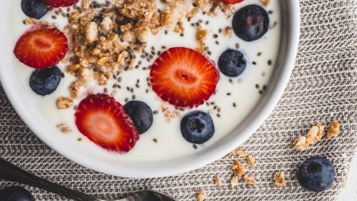 Alimentos fermentados: El yogur, el kéfir y el kimchi pueden aumentar la diversidad y el número de bacterias intestinales.16 Fibra: Las frutas, las verduras, los cereales integrales y las legumbres aportan prebióticos beneficiosos para la microbiota. Grasas saludables: Los frutos secos y el pescado graso, ambos ricos en omega-3, favorecen la salud intestinal.17 Dieta variada: Intenta seguir una dieta lo más variada posible y limita el consumo de alimentos procesados altos en azúcar y carbohidratos refinados para tener un microbioma sano.