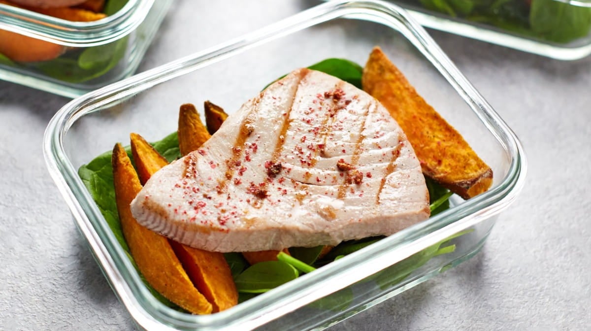 - Sirve con unas rodajas de limón y tus verduras favoritas, luego divide los filetes de atún con boniato en 4 tuppers.