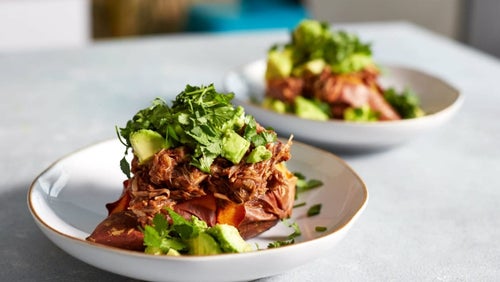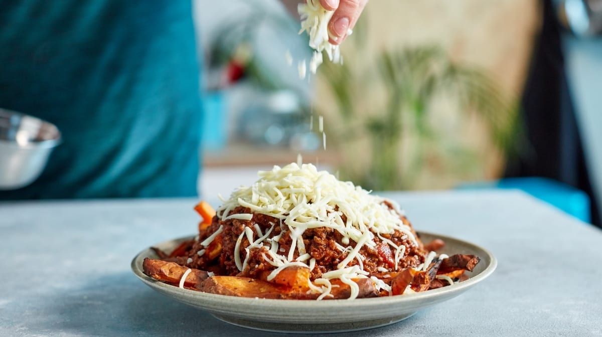 - A la hora de servir los platos, primero pon los trozos de boniato en el plato, añade por encima la mezcla de chili y cubre la mezcla con una generosa cantidad de queso rallado alto en proteína.