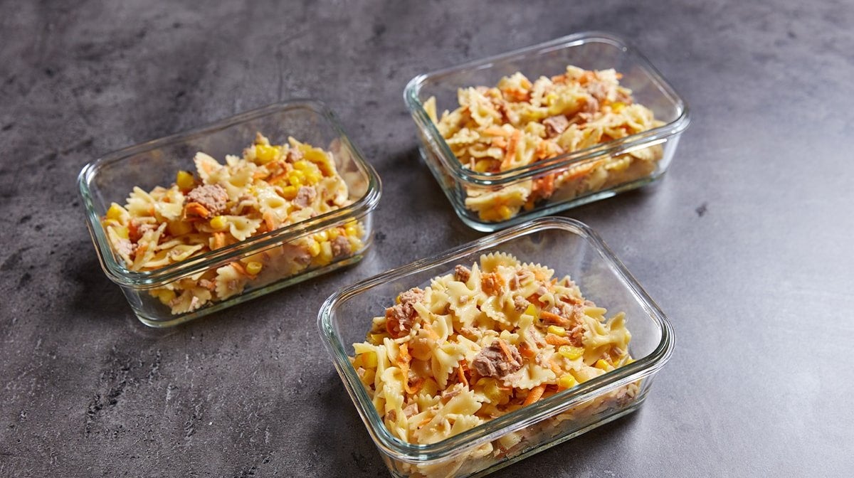 - Reparte la ensalada de pasta en tres recipientes aptos para comida y guárdalos en la nevera para tener comidas hechas para toda la semana.
