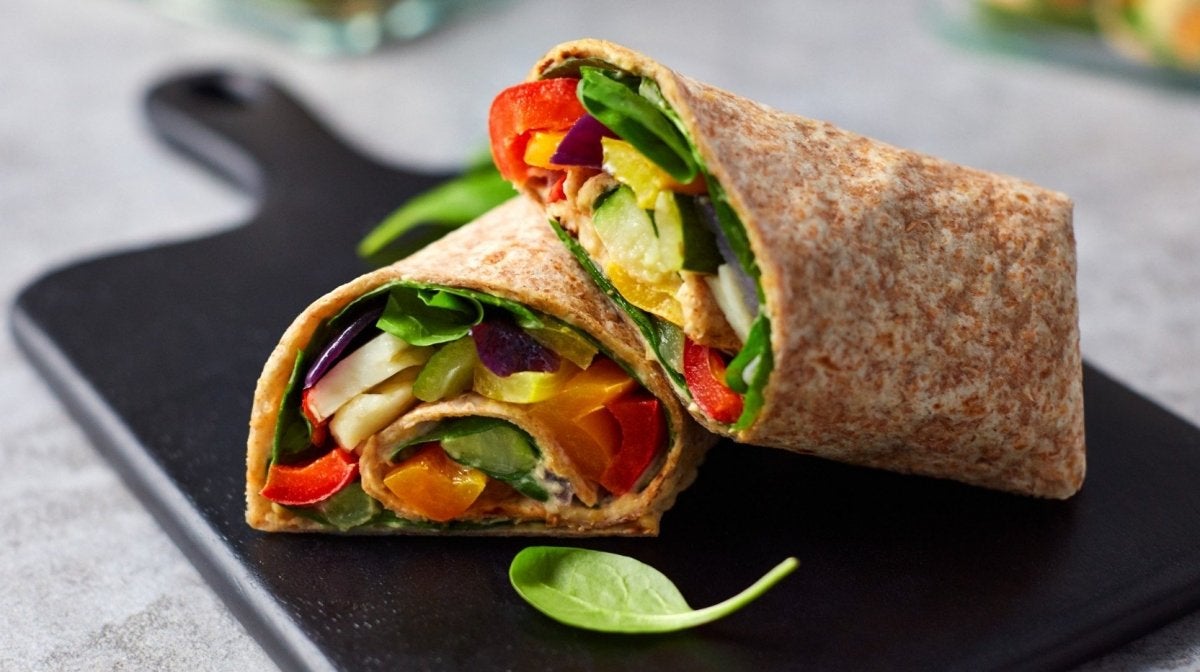 - Ahora hay que montar las fajitas: primero unta 1-2 cucharadas de hummus en una tortita, añade ¼ de las verduras, el halloumi y un puñado de espinacas o mix de hojas verdes.