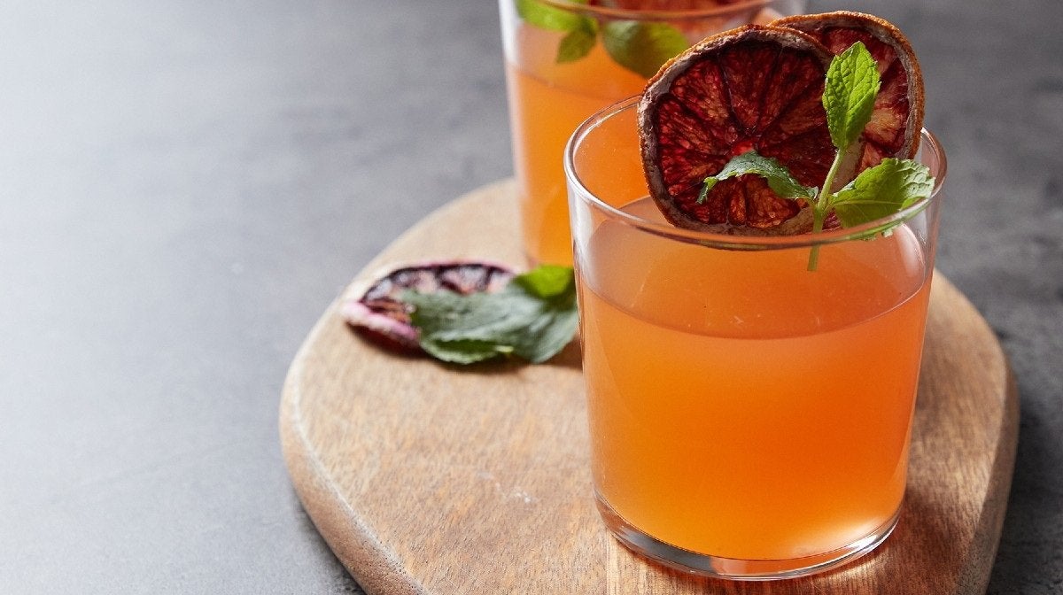 2 cazos de Essential BCAA 2:1:1 (Blood Orange) - Hojas de menta y gajos de naranja sanguina para decorar (opcional)