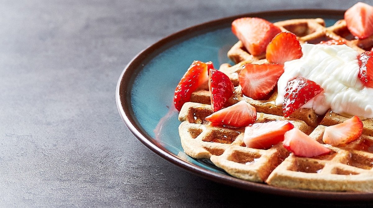 - Una vez hechos los gofres, sírvelos en un plato con los toppings que prefieras. Para esta receta hemos elegido sirope sin azúcar, yogur y fresas frescas.