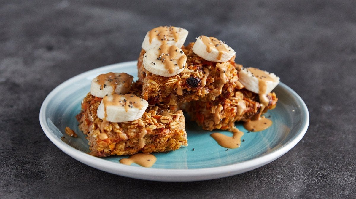 - Pasado el tiempo de horneado, saca la bandeja del horno y deja que se enfríe durante unos minutos. Una vez frío, corta el pastel de zanahoria en nueve cuadrados iguales y guárdalos en bolsas reutilizables con cierre y guárdalos en la nevera para tener siempre a mano un delicioso y nutritivo desayuno para llevar.