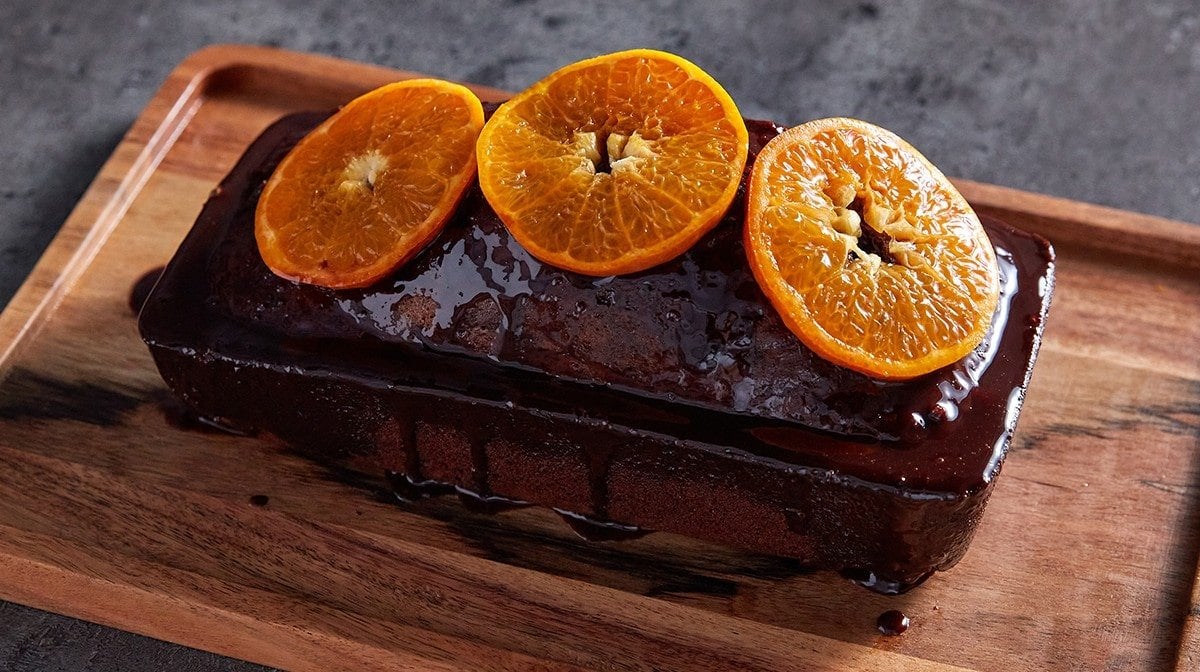 - Una vez horneado, saca el molde del horno y pincha con cuidado el bizcocho con un palillo. A continuación, vierte el glaseado de chocolate y naranja por encima del pastel y deja que se enfríe durante 10-15 minutos.