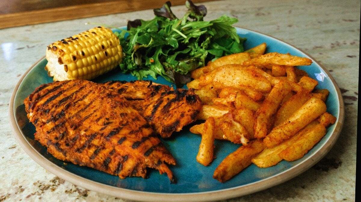 - Por último, sirve el pollo piri piri con las patatas y la guarnición que prefieras. Para esta receta hemos elegido una mazorca de maíz y ensalada.