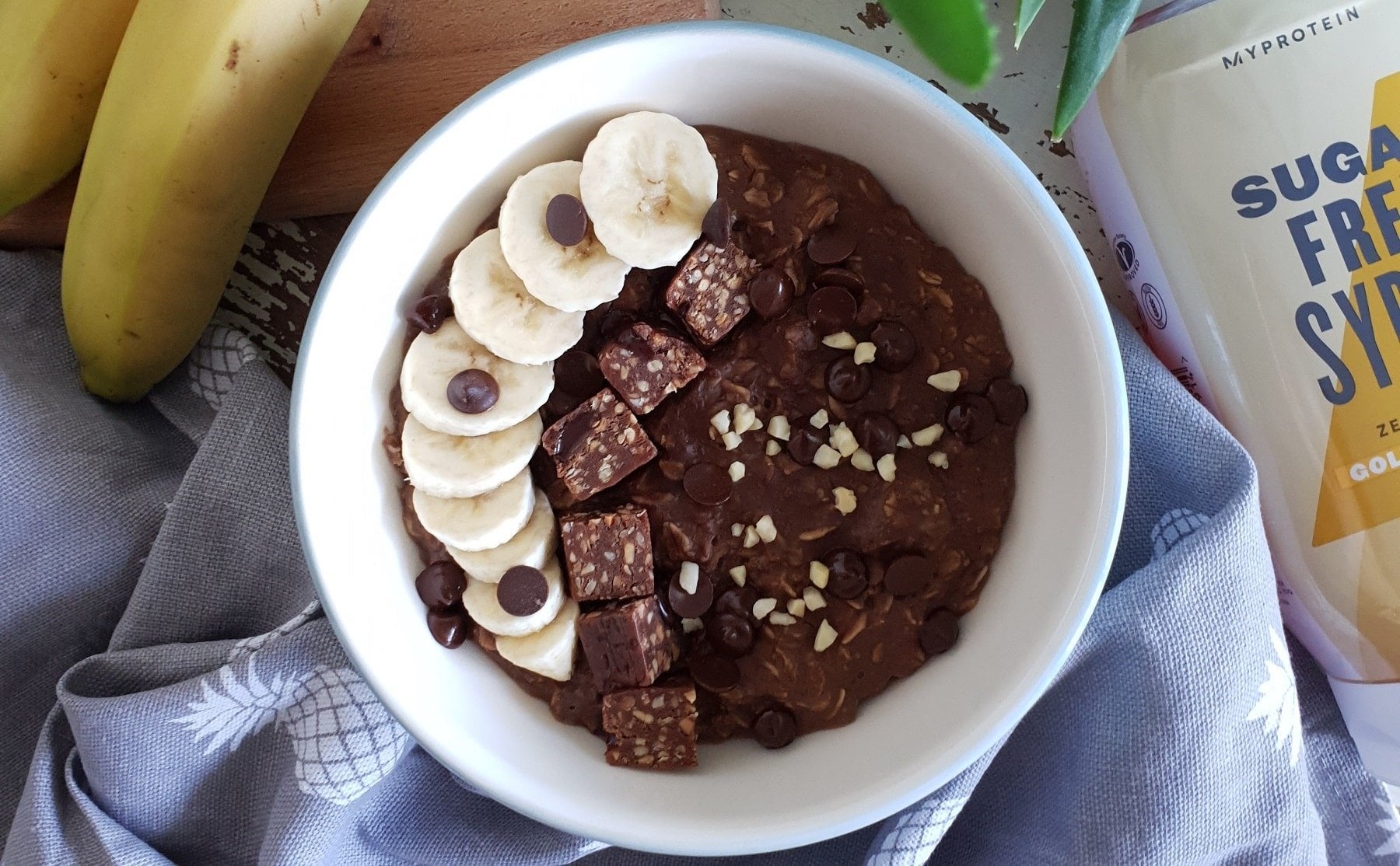 Por último, vierte las gachas de avena en un bol y añade los toppings que más te gusten. Para esta receta hemos optado por unas rodajas de plátano, chips de chocolate, almendra troceada y unos trocitos de Barrita Vegana Pea-Nut Square.