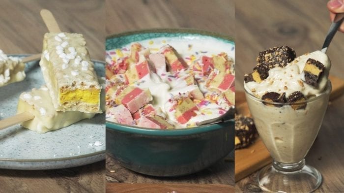 - Por último, sirve el helado en un bol y adorna con los trozos de la barrita de 6 capas por encima.